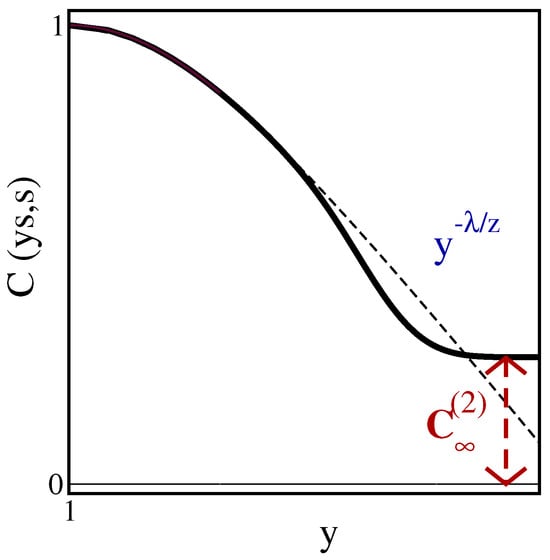 where [57] (4.4.42) was also used. The last two expressions reproduce the well-known [42] (Equation (4.24)), [43] (Equation (17)), as expected. Specifically, for , one has , and by comparison with the standard expected asymptotics (3a), one reads off , or, since [5], the auto-correlation exponent [40,42,43], as it should be. In the left panel of Figure 2, the auto-correlator is the full black line labelled .