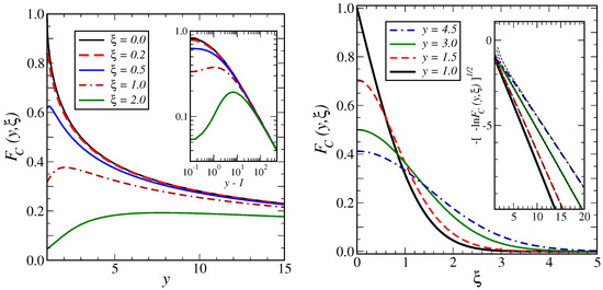 where is a Humbert confluent hypergeometric function of two variables [58,59]. In the scaled expression (22b), we observe the independence from the waiting time s. In what follows, with a slight change of notation with respect to (2), we shall write more shortly in terms of the scaling variables y and , defined above in (21). To the best of our knowledge, previous efforts have concentrated on the two-time auto-correlator (When considering the scaling influence of the temperature through , the two-time auto-correlator can be expressed via another Humbert function [42]. Taking into account all three scaling variables will likely involve a three-argument Lauricella/Horn hypergeometric series).