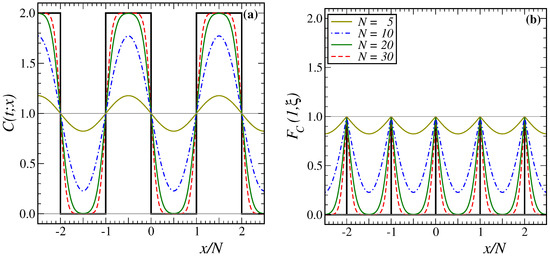 In Figure 4a, we show the analytically continued function as computed in Appendix C. By construction, for , it is an analytic function of x and periodic with period , but it only has a physical meaning in the interval . That function is quite distinct from the physical scaling function of the single-time correlator (2), with the scaling variables (21), which is shown in Figure 4b on the same scale. It becomes periodic in x with period N, as expected intuitively for a periodic lattice of N sites, but its derivative has jumps at with . For , it converges towards the infinite-size correlator; however, at , it has a minimum value which converges exponentially to zero as . For a fully disordered initial state, the correlator is non-vanishing only at .