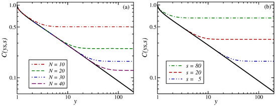 Given that we have previously seen that and , we confirm the generic expectations (4). That was the main aim of this work. Both scaling laws quoted in (4) are tested in Figure 5, respectively. Figure 5a shows that decreases with N while Figure 5b shows that increases with s, as long as . Figure 5 also serves as an illustration that the asymptotic form (38) already holds to good approximation for relatively small values of s and N. After the kinetic spherical model [19], this is only the second exactly solvable example where this kind of test was carried out exactly.