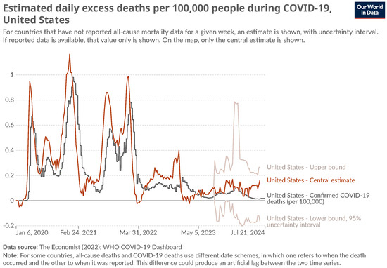 Time evolution of COVID-19 pandemic in USA. Source: https://ourworldindata.org/ (accessed on 9 August 2024).