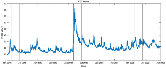 VIX Index in the interval 2018–2023. The considered periods, i.e., pre-COVID, COVID, and post-COVID, are marked by vertical lines.