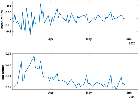 Figure 3, Figure 4 and Figure 5 illustrate the evolution of the return (Equation (1)) over the specified time periods. Importantly, the range of the mean return values is the smallest prior to the periods of the global spread of SARS-CoV-2, as depicted in Figure 3 (mean ∈ (−0.02, 0.02)). During the the global spread of SARS-CoV-2, as seen in Figure 4, this range expanded significantly to span (−0.1, 0.1), approximately five times larger. The greatest fluctuations were observed in March 2020, marking the pandemic’s onset. In April and May, fluctuations in mean values were reduced, staying within (−0.05, 0.05). In the post-COVID period shown in Figure 5, the mean return range was doubled compared with pre-COVID values, within (−0.04, 0.04). Given that the set of analyzed time series comprised 493 items, the differences within the set were examined by standard deviation at each point. For the pre-COVID period, the standard deviation range was (0.01, 0.02), with the exception of the one point at the end of April 2018. In contrast, during the pandemic, the differences between companies’ returns were approximately four times higher, falling within the interval (0.02, 0.08), particularly in March 2020. In the post-COVID phase, standard deviation fluctuations decreased compared with that during the pandemic but were still larger than that in the pre-COVID phase, within (0.015, 0.03). Comparing the mean and standard deviation trends of the analyzed set suggests a working hypothesis that pandemic effects have modified stock market time series evolution, but as restrictions have eased, signs of recovery are emerging.