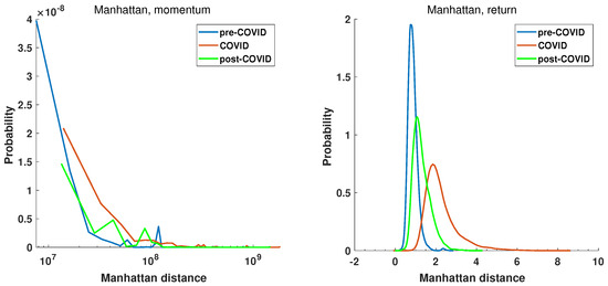 The plot of the probability distribution of Manhattan distance for the momentum time series is more difficult in interpretation. This is due to the range of distances observed. Despite the fact that the distance matrix comprises 493 companies and, therefore, 121,278 unique distances, it is insufficient to obtain a smooth distribution function for data spanning over 2 orders of magnitude. However, the common feature of all plots in Figure 9 and Figure 10 is that the COVID period probability distribution plots are different from pre- and post-COVID curves. The maximum of the Manhattan distance probability distribution function (PDF) of the return time series of the COVID period in Figure 9 is located at a greater distance than that of the pre- and post-COVID time series where the value of the maximum of PDF is smaller. The COVID-19 pandemic caused a shift towards greater distances and an increase in variance. The post-COVID Manhattan distance PDF curve (green line) appears to be reverting to the pre-COVID state (blue line). It is noteworthy that the Manhattan distance values observed in the pre-COVID periods are concentrated around zero, which is characteristic of a stable market situation. This evidence lends support to the selection of this period as a reference point. The second reference period, namely, the post-COVID period, also exhibits a maximum close to zero, indicating that the market state is likely to revert to a normal evolution. In this state, companies’ stocks evolve in a similar manner, and the difference in return time series is low, as shown in Equation (5).