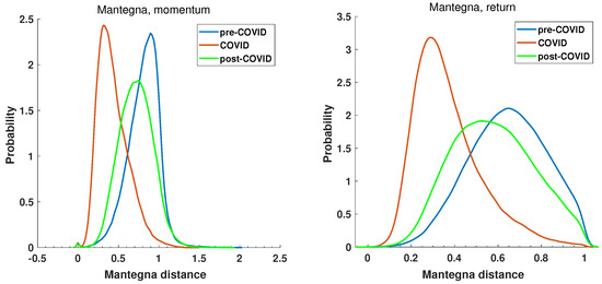 Furthermore, the recovery of the distance to the pre-COVID state is also evident in Figure 10, which depicts the Mantegna distance. However, the information obtained by Mantegna distance (Equation (3)) is substantially different, as it is based on the Pearson correlation coefficient, which indicates whether the relationship between the time series can be explained by a linear function. The probability density functions of the considered intervals in the case of the momentum and return time series are presented in Figure 10.