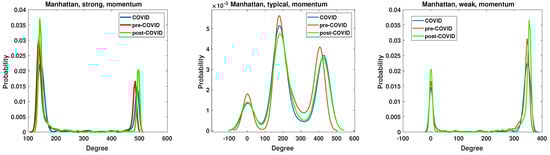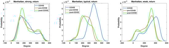 The node degree distribution properties of the generated networks are analyzed by the kernel function PDF estimation. The results are presented in Figure 11, Figure 12, Figure 13 and Figure 14. A chi-square test was used to determine whether the apparent differences in the node degree distributions were statistically significant. In all cases (Manhattan and Mantegna distances as well as for all considered networks and intervals), the hypothesis of no difference among distributions was rejected (at the significance level p = 0). The structure of the networks based on the Manhattan distance and momentum time series is illustrated in Figure 11. The plot demonstrates that the proposed cut-off points result in substantially different structures. The degree distribution of strongly correlated companies exhibits two distinctive maxima, indicating the existence of two distinct groups among strongly correlated companies. The first group comprises nodes with 150 links, while the second group is characterized by nodes that are connected to all other nodes. It is notable that during the period of the pandemic, the maximum values decreased, whereas in the subsequent period, the local maximum values reached their highest levels. The companies that are typically correlated exhibit three distinctive maxima, along with a group of disconnected nodes. The second group of companies is characterized by ≈180 edges, while the last distinguished group comprises nodes with ≈400 edges. In the network of typically correlated companies, the pre-COVID curve differs from the post-COVID and pre-COVID PDFs. In the pre-COVID period, the probability of observing disconnected nodes is approximately , while in the post-COVID and pre-COVID periods, this probability is approximately , indicating a lower probability of observing disconnected nodes. Similarly, the highly connected nodes exhibit almost identical COVID and post-COVID PDF curves, while the pre-COVID maximum is greater. The curves for the group of disconnected nodes and the nodes with the highest number of edges are almost identical for the period of the pandemic and the subsequent period of recovery. They differ from the pre-pandemic network. Therefore, it can be concluded that the system did not revert to its pre-COVID state.