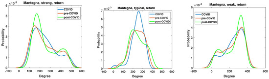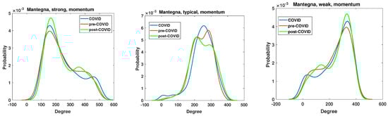 The Mantegna distance-based analyses of the node degree distribution are presented in Figure 13 and Figure 14, which depict the momentum and return time series, respectively. The networks were generated based on the value of the Pearson correlation coefficient, which represents the level of linearity among the time series. The greatest alterations in node degree probability density function (PDF) resulting from the advent of the SARS-CoV-2 pandemic are observed in the case of both weak and typical networks. The node degree PDF of the strong network demonstrates relatively small changes resulting from the global impact of the SARS-CoV-2 pandemic. The observed changes are concentrated at two specific values. The initial peak is observed for the degree , where the pre-COVID maximum has a value of , for the COVID curve , and for the post-COVID curve . Therefore, the probability of observing nodes with a relatively low number of edges increased during the period of the pandemic and did not revert to the previous state. This observation differs from that presented in the Manhattan picture in Figure 11, where the peak associated with the pandemic is the lowest and the system appears to revert to a state that existed prior to the advent of the pandemic. The typical network structure exhibits a distinct behavior pattern in comparison with the strong network, as illustrated in Figure 13. The primary distinction between the pre- and post-COVID network is that the former exhibits two modes, whereas the latter displays a single maximum in the node degree distribution. Furthermore, at the initial peak (node degree = 210), the system reverted to its previous state. Conversely, at the second maximum (node degree = 290), the probability of observing a node decreased from 0.0058 in the pre-COVID period to 0.0048. The weak network, comprising companies with the highest distance and lowest correlations, exhibits a mirror reflection of the strong network case. In this case, the most frequently observed node degree is 320 edges, and the pre-COVID time series exhibit a lower value of the maximum point. In contrast, the maximum increase occurs during the pandemic, while the post-COVID line displays the greatest value of the maximum. Consequently, the number of nodes with high edges attached increased during and after the pandemic. This finding aligns with the output of the strongly correlated network, where the number of nodes with a relatively low number of edges increased. Therefore, it can be concluded that the measures taken during the pandemic decreased the correlations in the Mantegna picture applied to the momentum time series.
