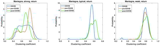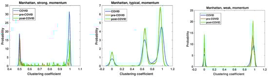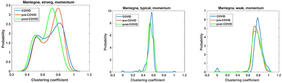 The results of the momentum time series analysis based on the Mantegna distance are presented in Figure 17. In this case, only the differences between pre-COVID and COVID clustering coefficient distribution for the weak network are statistically significant. However, the key differences observed in this type of analysis are worth discussing. The chi-square test results of the clustering coefficient distributions for networks based on the momentum time series analyzed by the Mantegna distance are presented in Table 2. The PDF of the clustering coefficient for the strong graph based on the Mantegna distance among the momentum time series shows clear changes caused by the COVID-19 pandemic. The pre- and post-COVID PDFs are quite similar in shape, but the maximum of those functions is separated by . Consequently, in the post-COVID period, the most probable node type has a lower clustering coefficient than in the pre-COVID time. The COVID period in this plot (i.e., Mantegna, strong, momentum) differs substantially from those of the reference intervals. In particular, the maximum of the clustering coefficient distribution is lower at compared with the pre- and post-COVID periods, where it is . In the case of the typical graph, the pre- and post-COVID PDFs of the clustering coefficient are identical. Therefore, for this specific type of network and distance measure, the system’s structure reverted to its initial state. The only discrepancy observed in the typical network is in the plot of the pandemic period, where the maximum is markedly higher, reaching , while for the other two curves, . The weak network, which focuses on the longest distances among Mantegna distances for momentum time series, does not demonstrate significant effects of the pandemic. The maximum of the clustering coefficient is increased by for the COVID period, in comparison with that for the pre- and post-COVID periods. Furthermore, the maxima for pre- and post-COVID are roughly the same, but the magnitude decreased in the post-COVID interval by . A second notable aspect of the weak graph is that the set of is non-negligible during the COVID interval.