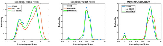 The clustering coefficient analysis results of strong, typical, and weak networks obtained for the Manhattan distance matrices based on the momentum time series are presented in Figure 15. They support the findings of the node degree analysis presented in Figure 11. The chi-square test applied to the clustering coefficient distributions for the momentum time series analyzed by Manhattan distance shows that the hypotheses that there are no differences among the distributions must be rejected at the significance level . In both the strong and weak networks, two distinct groups emerge as the dominant ones. In the case of the strong network, two distinct types of nodes emerge as particularly prevalent during the periods of the pandemic. The first group is characterized by a clustering coefficient of , while the second is characterized by a clustering coefficient of , which denotes a clique of nodes. During the period of the pandemic, the number of fully connected nodes increased markedly. It is noteworthy that the nodes with in the pre-COVID and post-COVID periods have the same value, whereas in the pre-COVID period, the number of nodes with is significantly smaller. Despite apparent similarities, the weak network analysis differs from the strong network clustering coefficient PDF. Once more, two principal groups emerge, although the initial set of nodes exhibits a clustering coefficient of zero, indicating a lack of connectivity. In the post-COVID period, the number of such nodes rises. A similar effect is observed for the second type of nodes with , which can be considered members of cliques. Furthermore, the maximum value of the clustering coefficient PDF was observed to have increased in the post-COVID period. The structure and evolution of the clustering coefficient of the typical network based on the Manhattan distance of the momentum time series differ from those observed in the weak and strong networks. The network can be divided into three classes of nodes based on their clustering coefficient: the disconnected nodes (with ), the nodes on a relatively dense network (), and the cliques (with ). It is noteworthy that this division is observed to be stable across all considered intervals. Only the magnitude of PDF is changed, and in the COVID period, the maximum values are significantly lower. It can be noted that the pre-COVID and post-COVID PDFs are almost identical, indicating that the structure of the typical network is recovering from its previous state after the COVID-19 pandemic. This observation differs from that of strong and weak networks, where the system in the post-COVID period differs from that of the pre-COVID interval.