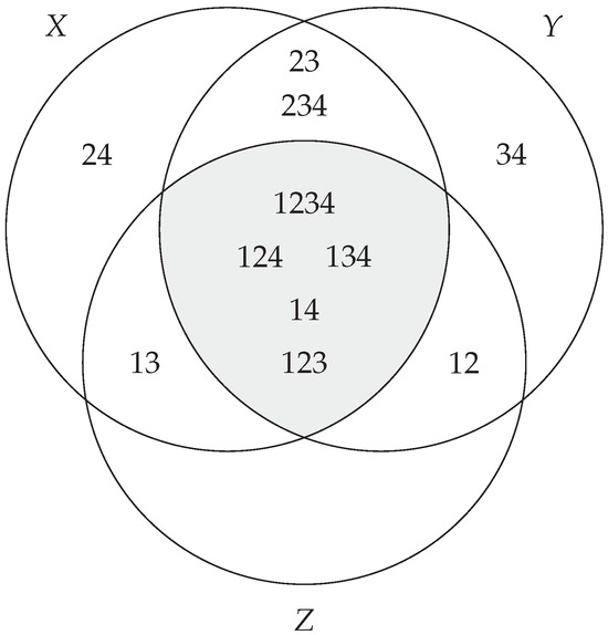 To accomplish this, we will leverage our previously introduced refined signed measure space , representing a collection of ‘atomic’ pieces of information [10,11]. This decomposition, built from the entropy loss when merging variable outcomes into coarser events (see for instance [12] for more context), allowed us to construct a Shannon-like measure which can discern between the dyadic and triadic systems of James and Crutchfield [3], which was demonstrated in [11]. This decomposition, coupled with the investigation of its algebraic properties in the present work, leads us to the capstone XOR result in Theorem 9.