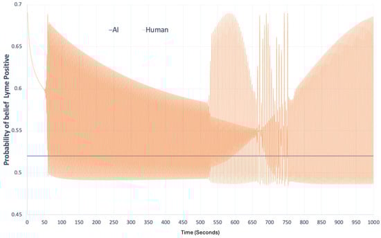 To demonstrate the second situation following the discussion in [83] that is based on quantum decision theory (QDT) and Kullback–Leibler relative information gain approach [89,90], a simulation for a two-decision outcome result was run with the following scenario. Suppose, based on the regional tick bite and Lyme diagnoses data, a search engine assumes that 52 percent of the people with tick bites contracted Lyme disease. Due to this data, the search engine optimizes its results in response to Lisa’s search entries in such a way that anyone reading the suggested pages would think that the probability of having Lyme disease is 0.52. As shown in Figure 2, a probability of positive Lyme disease belief for Lisa can oscillate in the case of continuous inquiry from a search engine. The oscillation shown in Figure 2 represents the ontic type of uncertainty that can bolster a specific decision outcome. We consider this oscillation to be the ontic type of uncertainty, because it is internal to the human; it is not directly accessible to an observer unless the human elicits her/his decision at any given time. This oscillatory behavior may converge later in time or diverge depending on Lisa’s cognitive schema. Therefore, capturing this type of uncertainty is important for properly modeling HITL-AI interactions in the design of decision support systems. Appendix A provides a detailed explanation of the mathematical formalisms for the proposed example.