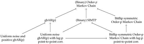 The aim of this subsection is to define special types of Markov chains and to prove some formulas that are applicable to them regarding the entropies of Definition 1. Although the experiments performed in this paper mostly involve generalized binary autoregressive models (see Definition 6 below), other types of Markov chains that have connections with generalized binary autoregressive models are also explored (see Figure 1) because they share certain properties with them, and entropy formulas that are interesting on their own can be derived with relatively little additional effort for these processes.