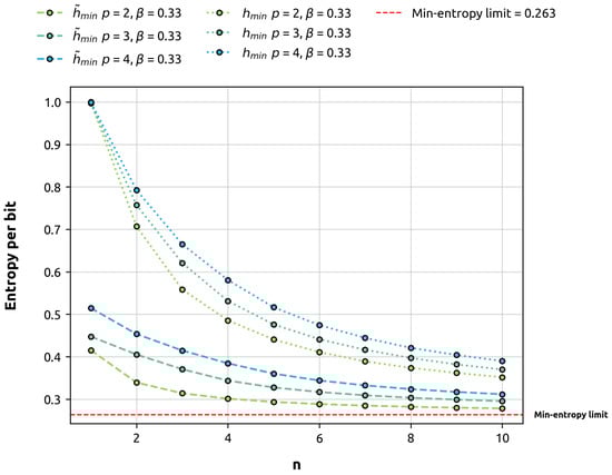 is bounded by 1 for all . For this reason, we are going to refer to this as the min-entropy per bit of the stochastic process .
