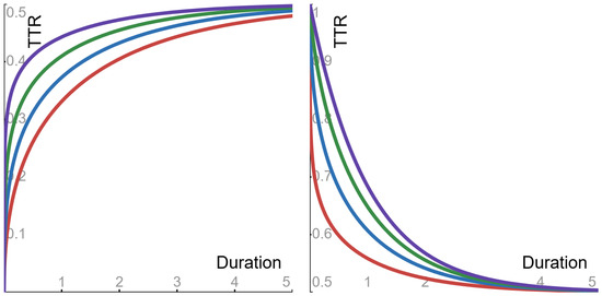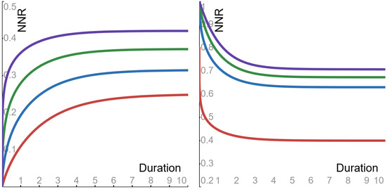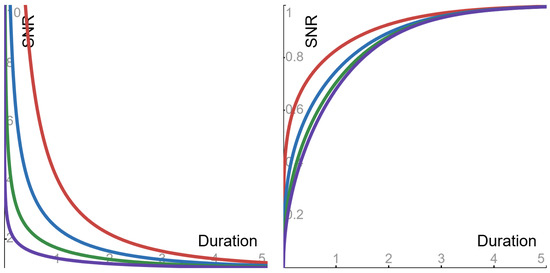 Consider the given information not to be zero, . Due to the properties of the function , the asymptotic value—as —of the signal-to-noise ratio of Equation (14) is the positive number . Also—as a function of the duration —the signal-to-noise ratio of Equation (14) displays the following behaviors (see Figure 1).