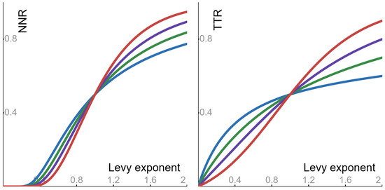 It follows straightforwardly from Equation (13) that , and that: when the Levy exponent is then the function is flat, . It is shown in Appendix A that the shape of the function is determined by the Levy exponent p as follows. When the Levy exponent is in the range then: , and the function is monotone decreasing. When the Levy exponent is in the range then: , and the function is monotone increasing.