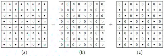 As shown in Figure 1, according to the checkerboard context model [20], we split the cover image into two sub-images, which consist of “Circle” and “Square” pixels, respectively. For the “Circle” sub-image, the values of the “Circle” pixels are maintained, while those of the “Square” pixels are set to 0. Meanwhile, just the values of the “Circle” pixels are set to 0 for the “Square” sub-image. Due to the pixel correlation of the two sub-images, each sub-image is used to predict the pixel values and complexities of the other sub-image.