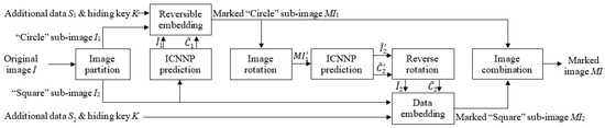 Then, and are rotated counterclockwise by 90 degrees to obtain the predicted “Square” sub-image and the predicted complexity of I2. Similarly to the “Circle” embedding, another part of additional data S2 is encrypted with K and then embedded into I2 to obtain the marked “Square” sub-image MI2.