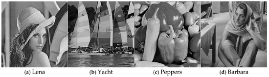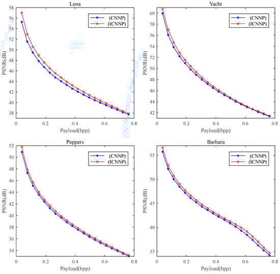 With the four 512 × 512 grayscale images shown in Figure 6 as cover images with the same embedding capacity (EC), we employed a PSNR (peak signal-to-noise ratio) between the marked image and the original image as the metric for objective image quality evaluation. In addition, we chose 100 grayscale images of size 512 × 512 randomly that were different from the training images from BOWS-2 [36], and we tested them with different embedding capacities (ECs) to evaluate the universality of the ICNNP.