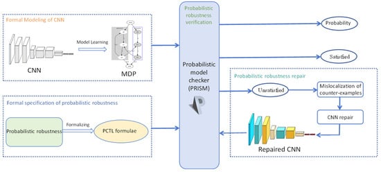 In this section, we propose a probabilistic model checking-driven robustness guarantee framework for CNN, i.e., PRG4CNN, as shown in Figure 1. We exploit probabilistic model checking to decide whether a CNN satisfies the probabilistic robustness, and repair the CNN by counterexample-guided sensitivity analysis if it does not satisfy the probabilistic robustness. This process comprises four components, as follows: formal modeling of CNN by model learning, formal specification of probabilistic robustness as PCTL, probabilistic robustness verification with probabilistic model checker PRISM, and probabilistic robustness repair by counterexample-guided sensitivity analysis. In presenting PRG4CNN, we take a CNN for binary classification tasks as an example, which is noted as Net 0. The network basic structure used for Net 0 is LeNet [] and the dataset used is the cat and dog classification dataset (https://www.kaggle.com/c/dogs-vs-cats/data, accessed on 20 December 2024) from kaggle. We use 80% of the samples in the dataset as the training dataset and 20% of the samples as the verification dataset. We will consider the probabilistic robustness of this network under the perturbation of three identical attacks with different amplitudes.