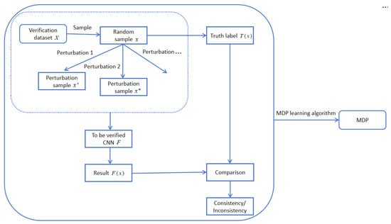 The learning process of constructing an MDP from a CNN to be verified is shown in Figure 2. denotes the verification dataset, denotes a single sample, and denote perturbation samples, F denotes CNN to be verified, denotes CNN function, denotes the prediction result of the CNN for sample , and denotes the true label of sample . The construction of the MDP mainly comprises the following steps: Firstly, the original samples are randomly sampled from the verification dataset, and different types of perturbations are added to the original samples to obtain different types of perturbation samples. Secondly, we compare the prediction results of the original samples and the perturbed samples in the CNN, as well as the truth labels, and construct the MDP through MDP learning algorithm. In order to ensure the validity of the MDP that we learned, it is essential to address three key issues: the selection of states, the selection of actions, and the computation of transition probabilities within the MDP.