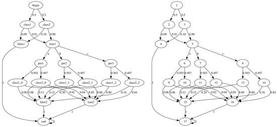 Let a, b and c denote three different types of perturbations with FGSM perturbation amplitudes of 0.05, 0.075 and 0.1, respectively. To verify the probabilistic robustness of Net 0 under the three perturbations a, b, and c, we randomly divide the verification dataset. The allowable error and confidence level parameters are set as = 0.05 and = 0.005, respectively. The number of recorded traces is set as = 30,000. The CNN Net 0 is formally modeled as an MDP using Algorithm 1, which is shown in Figure 3 (left). It contains the start state and the end state constructed in the initialization section, and the individual states of the first category and the second category. The actions of MDP are represented by the added perturbations a, b, and c. The transition probability matrix of the MDP is updated by Algorithm 1 (from line 3 to 9). In order to facilitate the subsequent probabilistic robustness verification in the model checking tool PRISM, we represent the states of MDP using numbers, which are shown in Figure 3 (right).