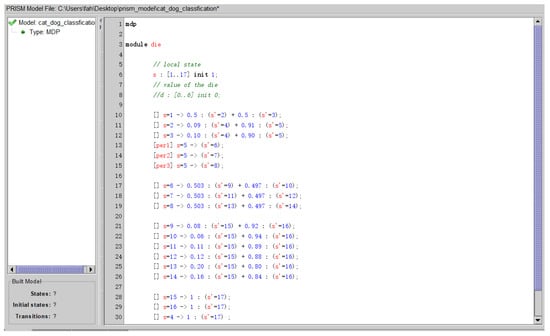 We transfer the probabilistic robustness verification of CNN to the PCTL probabilistic model checking of MDP. If the MDP satisfies the PCTL formulae of probabilistic robustness, the CNN to be verified satisfies the corresponding probabilistic robustness. If the MDP does not satisfy the PCTL formulae of probabilistic robustness, the CNN to be verified does not satisfy the corresponding probabilistic robustness. As shown in Figure 1, the MDP is learned from the CNN in Section 3.1, PCTL formulae are generated in Section 3.2. We use the famous probabilistic model-checker PRISM to verify the PCTL formulae on MDP. The learned MDP from CNN Net 0 is modeled in PRISM, as shown in Figure 4.