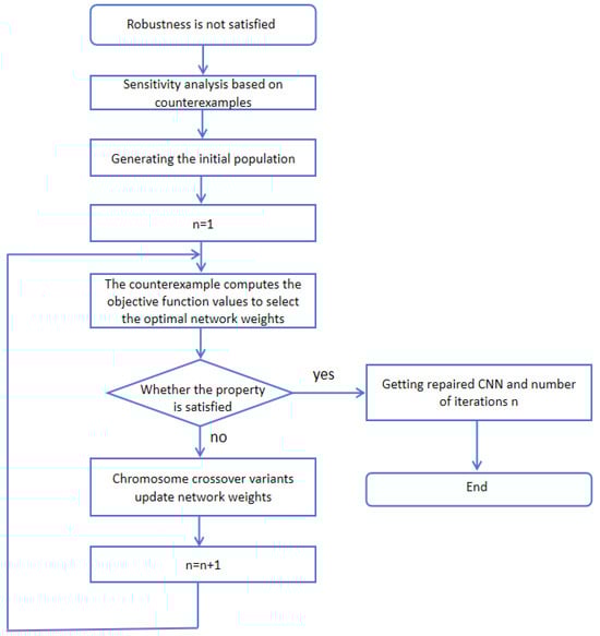 If the CNN to be verified does not satisfy the probabilistic robustness, we repair the CNN in terms of probabilistic robustness. This is an important component of our framework PRG4CNN. We use counterexample-guided sensitivity analysis to design a Genetic algorithm [] for iteratively repairing CNN regarding corresponding probabilistic robustness. The repair process is shown in Figure 6, which consists of two primary steps—error localization with counterexamples and CNN weight adjustment by the Genetic algorithm.