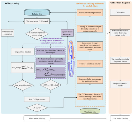 To effectively address the above issue, this paper proposes a novel semi-supervised fault diagnosis method under the scenario of imbalanced class information screening in unlabeled samples. Specifically, an information screening mechanism for unlabeled data based on active learning is first designed. This mechanism discriminates based on the differences in the intrinsic feature information content of fault samples, accurately screening out unlabeled data that are located near decision boundaries and difficult to clearly separate. Subsequently, by combining the maximum membership degrees of these unlabeled data in the classification space of the supervised model and comparing them with an active learning expert system, label information is assigned to the screened unlabeled data. Furthermore, a cost-sensitive function driven by data imbalance is constructed to address the information imbalance issue in unlabeled data screening, adaptively adjusting the weights of different class samples during model training, thereby guiding the training of the supervised model. Ultimately, through dynamic optimization of the supervised model and the feature extraction capability of unlabeled samples, the recognition ability of the diagnostic model for unlabeled samples is significantly enhanced. The flowchart of the proposed method is shown in Figure 1.