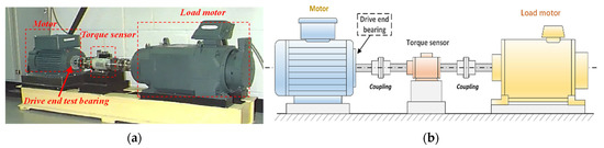 CWRU experimental platform: (a) bearing testing system and (b) schematic diagram of the platform.