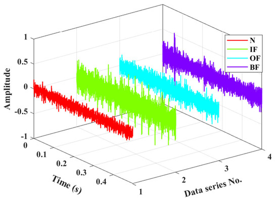 The CWRU rolling bearing experimental platform, as illustrated in Figure 2, primarily consists of key components such as a drive motor, torque transducer and encoder, and a load motor. To simulate different types of faults, electrical discharge machining technology is utilized to artificially implant 0.007-inch pitch faults on the inner race, outer race, and rolling elements of the bearings, respectively. During the experiment, the faulty bearing under test is installed on the drive end of the motor, using SKF6205 bearing with parameters in Table 1. During data acquisition, the motor speed was maintained at a constant 1772 rpm with a constant load of 1 Hp applied. To precisely capture the vibration signals resulting from bearing faults, accelerometers were installed on both the drive end and fan end of the motor, and the data sampling frequency was set to 12 KHz. Table 2 provides the types of experimental bearing faults. The collected vibration data of bearings under different health states are shown in Figure 3.