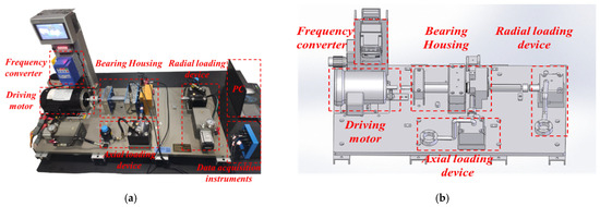 Rolling bearing fault diagnosis platform: (a) experimental testing system and (b) schematic diagram of the platform.