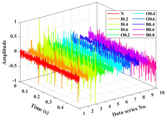 To further validate the effectiveness and advantage of our proposed method, we conducted experiments on an SMU rolling bearing fault diagnosis platform, as illustrated in Figure 4, which primarily comprises a drive motor, a frequency converter, a bearing housing, a hydraulic loading device, vibration acceleration sensors, and a data collection device. The sensors are linked to an industrial computer installed with DHDAS software through an NI PCI-4472 card, thereby collecting experimental data. The tested bearing is an ER-16K deep groove ball bearing, and its parameters are shown in Table 3. The experiment simulates a total of ten health conditions of the rolling bearing, including normal condition, inner race pitting 0.2 (I0.2), inner race pitting 0.4 (I0.4), inner race pitting 0.6 (I0.6), outer race pitting 0.2 (O0.2), outer race pitting 0.4 (O0.4), outer race pitting 0.6 (O0.6), ball pitting 0.2 (B0.2), ball pitting 0.4 (B0.4), and ball pitting 0.6 (B0.6), as listed in Table 4. During the experiment, the motor speed is fixed at 1800 rpm, and the load on the magnetic particle brake is set to 15 Nm. The vibration signals are accurately collected with a sampling frequency set at 25,600 Hz for each condition, and the vibration data of the bearings are described in Figure 5.
