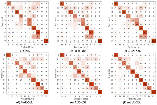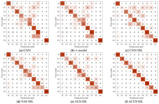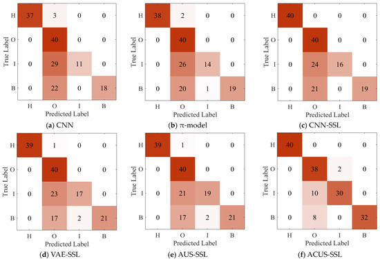 The confusion matrix for Experiment 1 is illustrated in Figure 6. Observing Figure 6, it is evident that the proposed ACUS-SSL method achieves precise identification for each fault category, with fault discrimination accuracy higher than other comparative methods. This is attributed to its reliable unlabeled sample information screening mechanism, which accurately selects high-quality unlabeled data to effectively augment the original labeled training dataset, thereby enhancing the model’s diagnostic capability. Additionally, by constructing an imbalance-driven cost-sensitive function, the method addresses the potential information imbalance issue encountered during unlabeled sample screening, ensuring the recognition accuracy of the model for minority fault categories while maintaining the overall fault diagnosis performance of the model.
