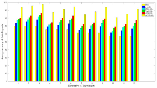 Finally, when comparing the overall results of Experiments 7 to 9, we can observe that after introducing a significant number of unlabeled samples to enhance the models’ feature capture capabilities, the π-model, CNN-SSL, VAE-SSL, and AUS-SSL all demonstrate improvements in fault diagnosis accuracy. This phenomenon underscores the significance of unlabeled samples in augmenting the models’ fault feature extraction and recognition capabilities. By effectively leveraging these unlabeled samples, these methods not only enrich the training data but also further enhance the models’ sensitivity and precision in detecting intricate fault features. Furthermore, the proposed ACUS-SSL method consistently exhibits the highest diagnostic accuracy. This is because when facing complex diagnostic tasks, the proposed method ensures the reliability of the label information of the selected unlabeled samples on the one hand. On the other hand, by constructing a cost-sensitive function driven by data imbalance, it effectively addresses the issue of information imbalance in unlabeled sample selection, thereby adaptively adjusting the weights of different classes of samples during model training and improving the model’s recognition ability for minority or difficult-to-classify categories.