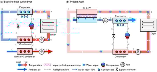 Schematic of (a) the baseline heat pump dryer, and (b) the proposed dryer with a membrane energy recovery ventilator. The baseline uses a heat pump to condense water vapor, where its hot condenser coil is placed to reheat the air stream, and then rejects excess heat to the ambient air through an auxiliary condenser. The proposed dryer removes water vapor with a membrane that exchanges vapor with ambient air, reducing heat loss and reheating energy. The heat pump that reheats the dehumidified air stream draws its heat from the humidified ambient air stream, thereby reducing the temperature rise.