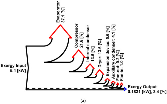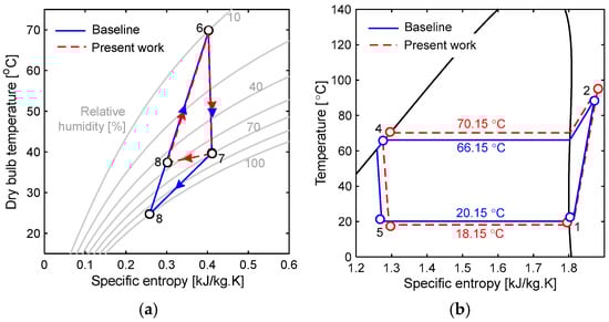 Grassman diagram of the (a) baseline and (b) present system at 35 °C ambient temperature and 5% relative humidity. The other variables are kept constant, as mentioned in Figure 3.