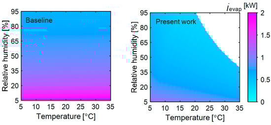 Exergy destruction in the evaporator of the heat pump in the baseline (left) and present system (right) as ambient temperature and relative humidity are varied. The membrane’s sensible and latent effectiveness (0.7 and 0.7, respectively), dryer air inlet conditions (70 °C and 10% RH), dryer capacity (7 kg), dryer air velocity (1 m/s), superheat (5 °C) and subcooling (5 °C) in the heat pump are kept constant as specified in the modeling assumptions in Section 2.2.