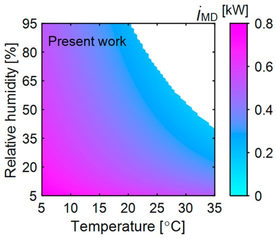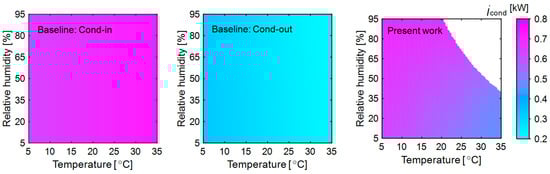 In contrast to the baseline, in the present system, the evaporator exchanges heat with ambient air leaving the membrane dehumidifier and cooling it until it provides the desired heat load to the condenser. The exergy destruction in the evaporator of the present system is shown in Figure 3. The contour region represents the operational boundary; outside this region, the system does not achieve the required moisture removal. At low ambient temperature (5 °C) and relative humidity (5%), the ambient air has low energy, becoming warm and humid (29 °C and 89% RH) after absorbing heat and moisture in the membrane dehumidifier. However, since the airflow rate from the membrane dehumidifier is relatively low, the evaporator needs to cool the air to a lower temperature (10 °C) to meet the condenser’s heat load requirement. This necessitates a lower evaporator operating temperature (5 °C). Thus, a significant temperature difference between the air and refrigerant results in high exergy destruction in the present system at low ambient temperature and relative humidity. Conversely, at high ambient temperature (35 °C) and relative humidity (40%), the air possesses high energy, and the resulting air from the membrane dehumidifier is also at a high temperature (38 °C). As a result, the evaporator cools the air only to 26 °C and can operate at 21 °C to deliver the required heat to the condenser. This smaller temperature difference between the dead state and working fluids leads to a lower exergy destruction rate (0.42 kW). This demonstrates the advantage of evaporator heat exchanges with the ambient air than with the drying air stream.