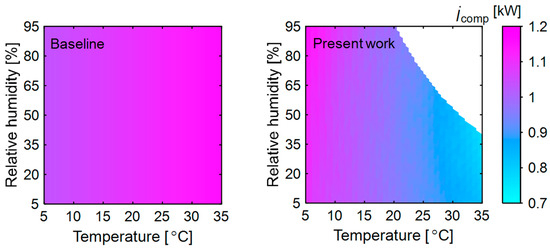 Exergy destruction in the compressor of heat pump in the baseline and present system at different ambient temperatures and relative humidities. The other variables are kept constant as mentioned in Figure 3.