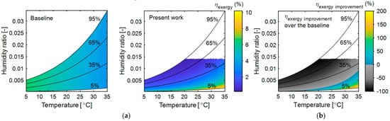 At low ambient temperatures, the total exergy input in the present system is very similar to that of the baseline system, with only a 1% difference. The high temperature loss in the membrane dehumidifier causes minimal net energy savings, and the evaporator operates at a lower temperature (<15 °C) compared to the baseline system. This results in high exergy destruction due to the lower evaporator operating temperature, along with additional exergy destruction in the membrane dehumidifier, leading to lower exergy efficiency. However, the present system’s exergy efficiency is much higher than the baseline system at high ambient temperature (>20 °C) and low relative humidity (<30%). The proposed system performs better under ambient conditions that minimize temperature loss in the membrane dehumidifier and that enable a higher evaporator operating temperature. The overall improvement in the exergy efficiency of the proposed system compared to the baseline system under different ambient conditions is shown in Figure 7 (right). Although the exergy efficiency of the present system appears to be better than that of the baseline system only within a smaller operating range, the heat pump capacity of the present system is reduced by up to 50% compared to the baseline system for drying the same quantity of material. This subsequently contributes to reduced energy consumption and exergy input.