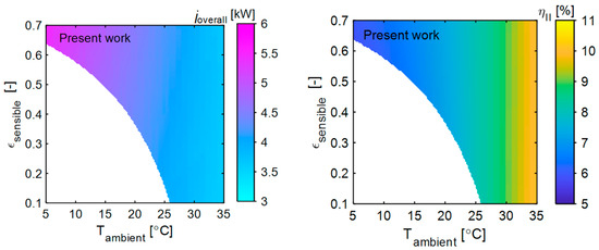 The exergy analysis so far has considered the membrane dehumidifier’s sensible and latent effectiveness as 0.7 each, respectively [40]. However, our recent studies explored novel nano-coatings for thermally insulative, highly water vapor-selective, and permeable membranes designed for high-temperature dehumidification applications. To assess the impact of a thermally insulative vapor-selective membrane on the exergy performance of the present system, the sensible effectiveness of the membrane dehumidifier varied between 0.1 and 0.7. The overall exergy destruction and exergy efficiency of the present system at different sensible effectiveness across various ambient temperatures are studied and presented in Figure 8.