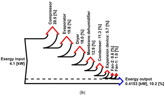A detailed exergy flow of the components in the baseline and present system is represented in a Grassman diagram, which is an exergy version of the Sankey diagram (Figure 9). In the baseline system, the evaporator and other heat pump components contribute to significant exergy destruction due to the large temperature difference between the refrigerant at the evaporator (20 °C) and the dead state (35 °C). However, in the present system, the evaporator exchanges heat with ambient air, resulting in lower exergy destruction. In the present system, the temperature difference (3.2 °C) between the air approaching the evaporator and the dead state is much smaller than in the baseline system (19.2 °C). Additionally, the dehumidification process in the present system occurs at a higher temperature, resulting in 25% less exergy destruction compared to the dehumidification process in the baseline system. The reduced temperature loss using the membrane dehumidifier allows hotter air to enter the condenser, significantly reducing exergy destruction in the condenser. The exergy destruction in the dryer (0.72 kW) is the same in both systems. However, because the total exergy input is lower in the present system, the percentage of exergy destruction in the dryer appears higher than in the baseline system. The reduced exergy input and lower exergy destruction in the heat pump components contribute to higher exergy efficiency in the present system.