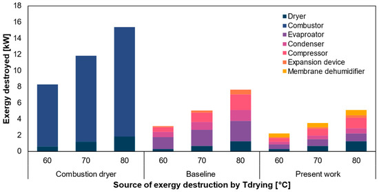 Exergy destruction in the major components of the natural gas-fired dryer, baseline heat pump dryer and the present systems at different drying temperatures (60 °C, 70 °C and 80 °C), with an ambient condition of 35 °C and 5% relative humidity. The other variables for the baseline and proposed system are kept constant, as mentioned in Figure 3.
