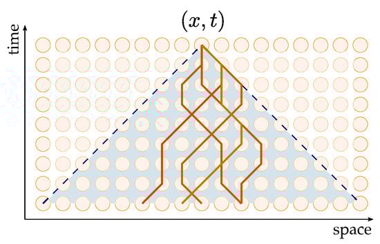 The path sum approach consists of expressing the state of the system at a given time as the outcome of all the possible evolutions allowed by the dynamics, each identifying a path on the space–time lattice. This translates into expressing the state as the result of the action of on the generic initial state , summed over all possible paths s and all points y in the past causal cone of site (Figure 1):