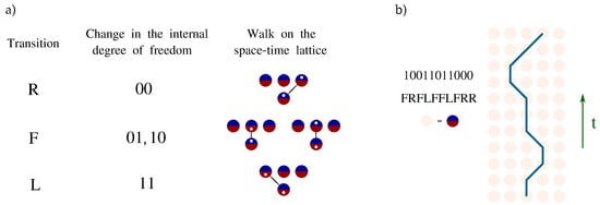 where . Each step of the automaton consists of a shift acting on coordinates space according to the action of the corresponding transition matrix on the internal degrees of freedom, with and . A right shift (R) increases the site coordinate of right modes by one, a left shift (L) decreases the site coordinate of left modes by the same amount, and a free shift (F) leaves the site coordinate unchanged upon flipping right to left mode and vice-versa. The evolution of the field over T time-steps is given by and can be analyzed in terms of paths connecting sites on the space–time lattice . We can then associate the generic path connecting x to y in T time-steps with a string of transitions, which gives the overall transition matrix :