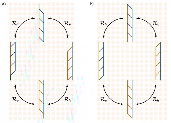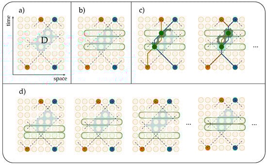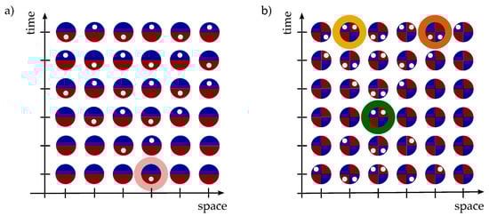 Due to the on-site nature of the Thirring interaction (8), a necessary condition for two particles to interact at step t is that they occupy the same site, i.e., , with opposite internal degrees of freedom. This observation, together with Equation (11), leads to a necessary condition on the initial states for an interaction to occur at a given point in space and time. For instance, consider the scenario represented in Figure 3b, where the evolution of two particles is depicted. Each site can accommodate two particles, each carrying two internal degrees of freedom. Hence, we divide each site into four quadrants: each particle disposes of a red quadrant and a blue one. Suppose the particles interact at a given site (highlighted in green). By applying the usual rules for the free evolution (which is unitary and thus reversible), we can fill the containers across the lattice with the internal state of the both particles. Notice that at the initial time step (corresponding to the bottom row), whenever the second particle is in the same (opposite) internal state as the first one, the two are separated by an odd (even) number of sites. The present graphical representation of the particle Hilbert space offers a valuable tool, applicable to many-particle systems and potentially accommodating dynamics that do not conserve particle number, with each site hosting a Fock space.