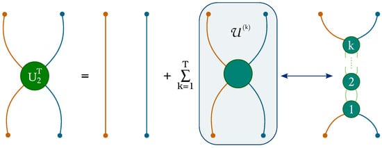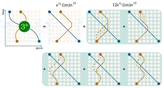 We now turn to the description of the perturbative techniques developed for the evaluation of transition matrices in the two-particle sector of the Thirring QCA. The path sum approach requires a thorough classification of all the allowed pairs of paths based on the number of intersections between them to determine how many times the on-site coupling must be accounted for. The computational complexity of this task is exponential with respect to the size of the portion of the space–time lattice involved in the process. To reduce complexity, we adopted the following expedient, allowing for the separation of the intersections between paths and interactions of the particles, which would otherwise coincide. We write the QCA for T evolution steps of two particles by expressing each interaction term as , where I denotes the identity on the Hilbert space