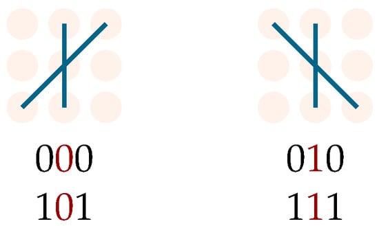 This section introduces mathematical tools for analyzing and classifying particle paths in the interacting scenario. Detailed proofs can be found in Appendix C. The central result we present here is that, given localized initial conditions of the particle, the free dynamics of the automaton univocally determines its state at each site of the space–time lattice. Combined with the Pauli exclusion principle, this yields necessary boundary conditions for particles to interact at any space–time point. We denote by bit 0 the right mode of the field and by bit 1 the left mode. The evolution path of a single particle can thus be described both with a string of transitions, comprising symbols , and with a binary string associated with the internal state of the particle at each time step. Unlike the encoding in terms of , where, e.g., substrings , , , or are prohibited by the algebra of the transition matrices, the main advantage of employing binary strings lies in the fact that any sequence of 0s and 1s identifies a valid path. We begin by defining a mapping between binary strings of internal degrees of freedom and the corresponding strings of translations on the lattice, which serves to elucidate the argument (Figure 2).
