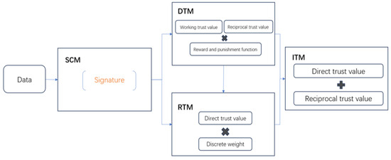In order to complete the improvements above, we divided PB-ATEM into four modules according to different parameter categories: signature computing module, direct trust module, reciprocal trust module, and integrated trust module. Figure 1 shows the framework of the model. The process of each module is as follows: