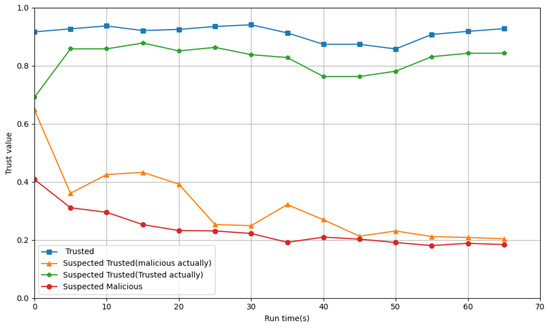 Figure 3 shows how the integrated trust values of these four types of processes change over time in PB-ATEM. As shown in Figure 3, since each type of process is assigned different adaptive weights, they have different initial trust values. Processes classified into trusted categories remained at a stable level throughout the monitoring period. For suspected trusted processes, we artificially modified the start parameters in the scripts of some trusted processes, so that the parameters of these processes will fluctuate slightly. Then, these trusted processes and some malicious processes are classified as suspected trusted processes. When processes enter the stable phase, the trust values of these trusted processes will soon return to the normal level. For malicious processes initially classified as suspected trusted by PB-ATEM, we retrieved their runtime parameters and found that this type of malicious process initially disguises itself as a normal process by faking low power consumption and low CPU usage, simulating a memory leakage pattern. However, when the malicious process launches an attack, its performance parameters exhibit significant fluctuations over a period of time. PB-ATEM detects these fluctuations and applies corresponding penalties while adaptively tracking the malicious process until it is fully identified. For suspected malicious processes, their trust values will remain low and continue to decline.